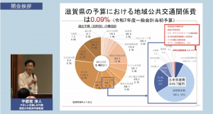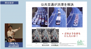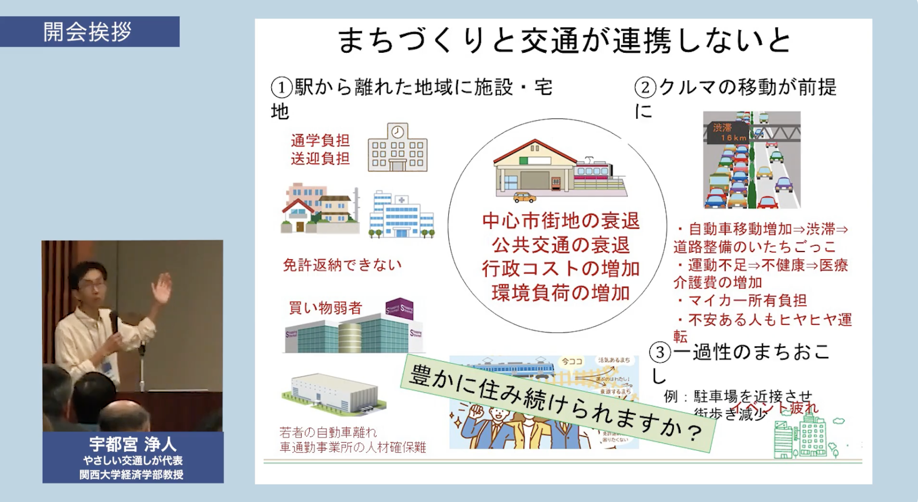 冒頭は、やさしい交通しが代表 関西大学の宇都宮浄人(うつのみやきよひと)教授より、近江鉄道の上下分離の際、市民自ら交通とまちづくりを考え対話する必要があったことから活動を始めたと紹介されました。まちづくりと交通が連携することで渋滞・中心市街地の衰退・行政コストの増大など様々な弊害が防げるとされました。
