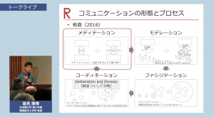 滋賀県でも、未来に向けた挑戦が始まっています。立命館大学 塩見教授から、県民フォーラムとワークショップの構成について説明がありました。県民にわかりやすく伝えるメディテーションがフォーラムで行われ、そこから意見を引き出すモデレーション・ファシリテーションがワークショップで行われたのでした。