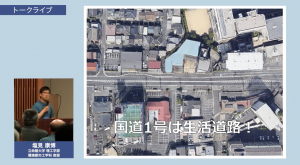 立命館大学塩見教授からは、草津市街を横切る国道1号は、市内に関係ない自動車も多く通行し市街を分断してしまっている問題点や、道路容量から自動車の量を減らすことで渋滞が減らせることなどをわかりやすく説明されていました。
