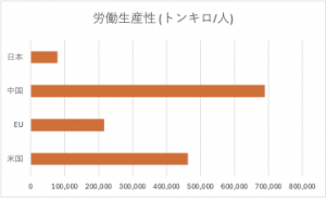 中国の内航が約14,000kmと突出した距離を輸送していることがわかります。これは沿岸が長いということもありますし、長江のような巨大河川を船舶が行き交い内陸の物流を担っていることもあります。船は少人数で大量の貨物を運べますので、これが中国の輸送労働生産性を引き上げていると推定できます。