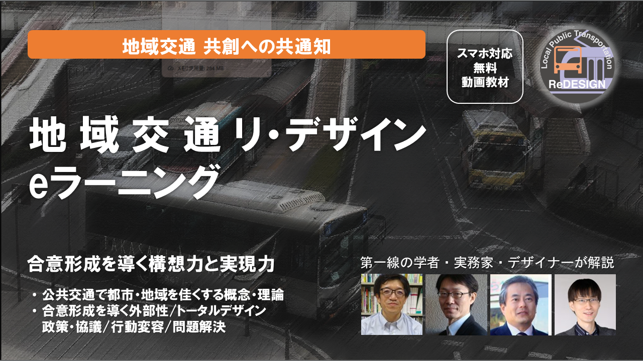 - 公共交通で都市や地域を佳くしようとする視点を啓発するため,普遍的な「概念・理論」の解説を中⼼に据えて解説します。地域交通をリ・デザインするうえで求められる「構想⼒」や「実現⼒」の向上が図られ,地域公共交通の確保・維持に施策を終始させるのではなく,持続可能な地域社会を実現するために公共交通を活かす視点やノウハウを持ち,他主体との「共創」をコーディネートすることが期待されます。