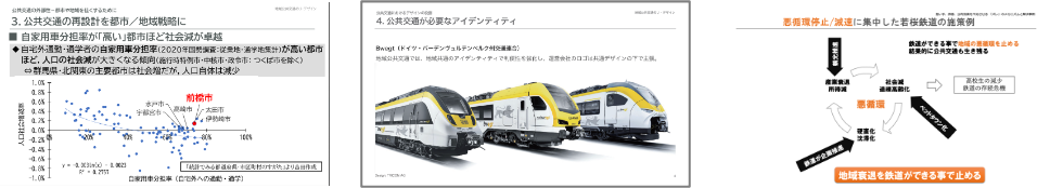 内容も、数値根拠や事例(八戸・会津若松)などを踏まえて構成されており、大変分かりやすく、また、公共交通を都市交通と生活支援交通に分類することで施策展開が異なることを明示しており、理解を深める教材としても有効であると思いました。