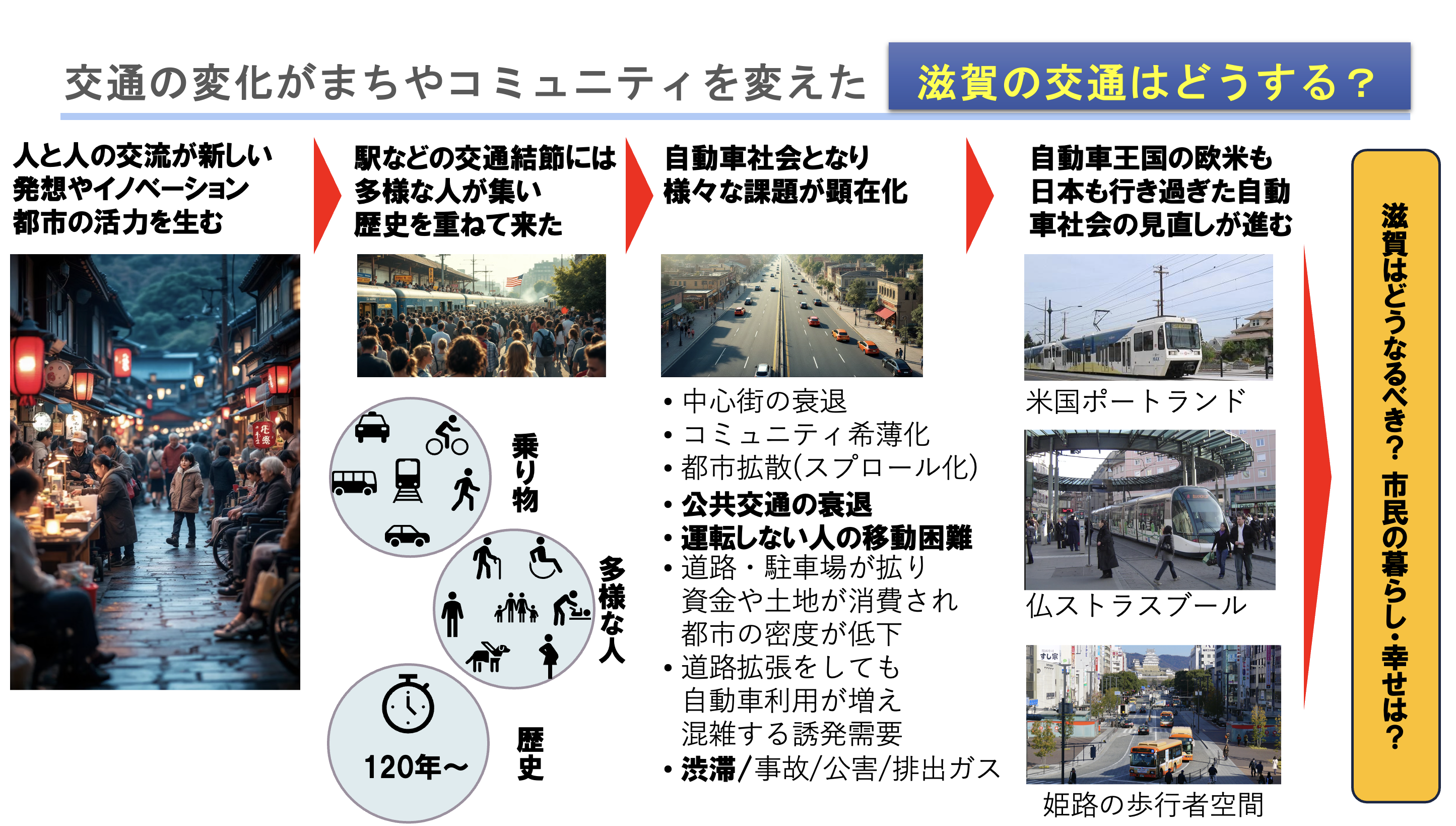 滋賀県のワークショップやフォーラムでは語りきられなかった交通とまちづくりの切っては切れない関係など、交通を考える上で大切な、しあわせのまちを作るための考え方をお伝えします。