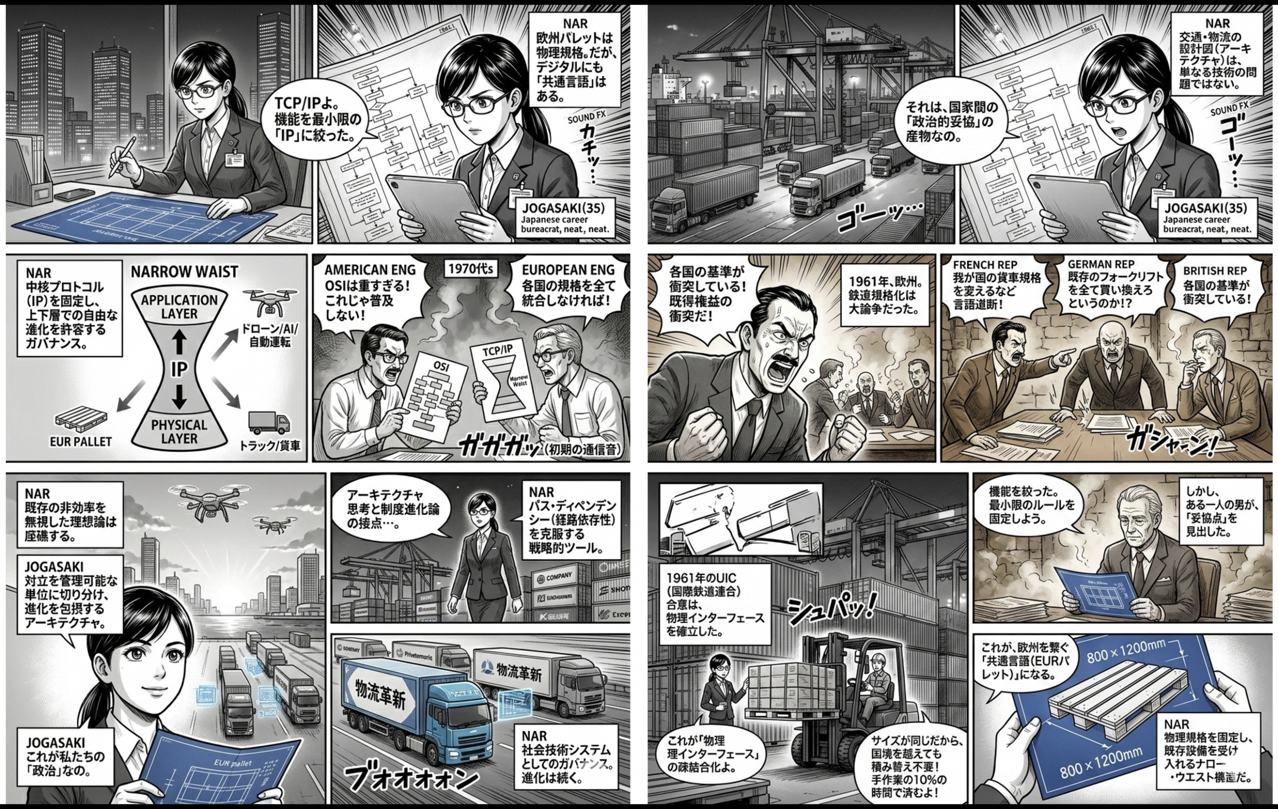 1961年の欧州パレット(EUR)規格成立時における、フォークリフトメーカーや倉庫業者、鉄道事業者間の具体的な利害衝突とその解消プロセスを深掘りしています。既存設備という負の「経路依存性」を、荷役時間90%削減という圧倒的な経済的合理性がいかに無効化したか、その政治交渉の実態を追跡しています。また、インターネットのTCP/IPが、既存の垂直統合モデルを「疎結合化」することで、既得権益の囲い込みをいかに技術的・制度的に打破したか、そのガバナンス史を構造化しています。
