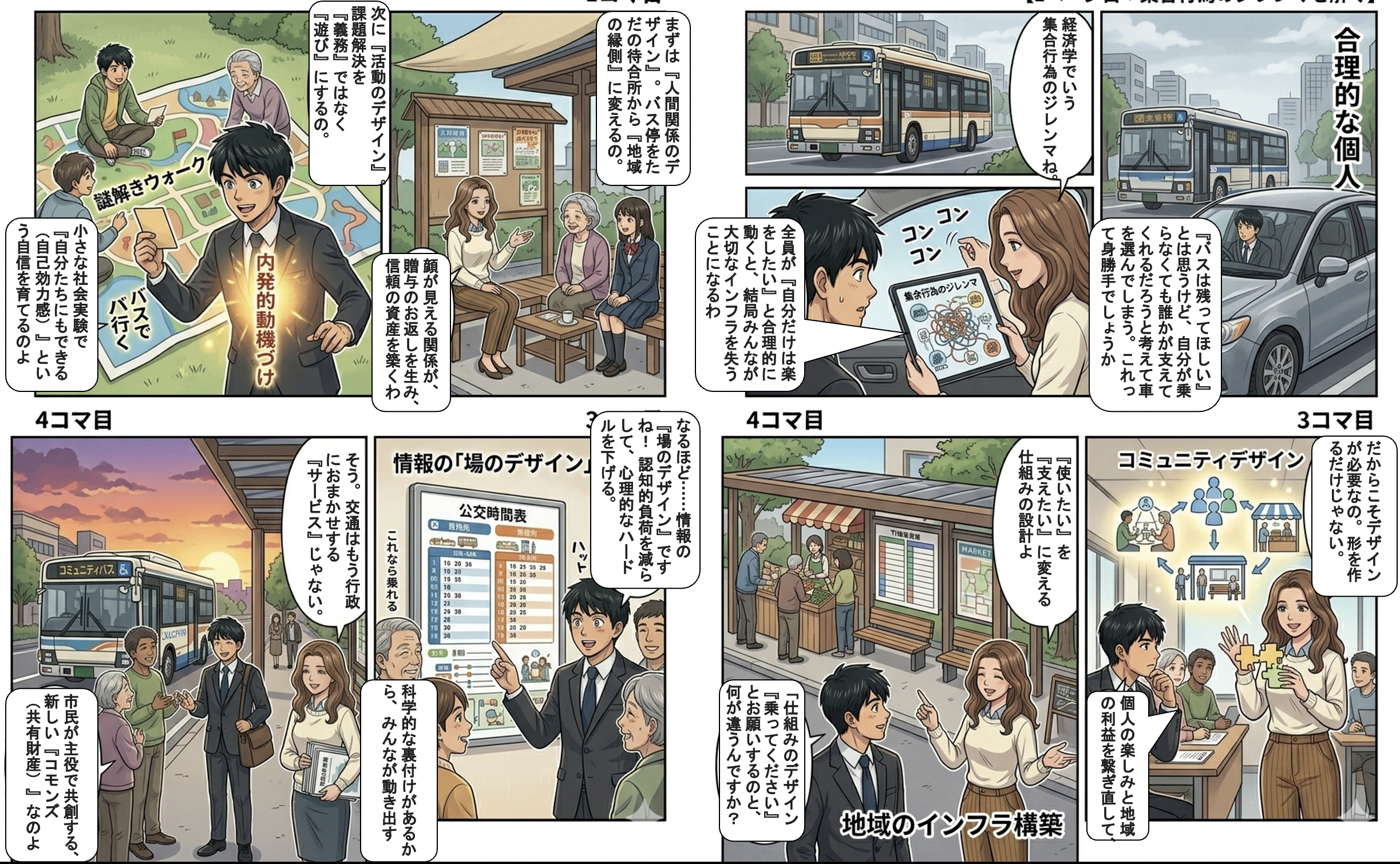 コミュニティデザインは、交通という社会資本を「私たちのもの」として取り戻すための設計図です。まずは「なぜ地域交通が衰退するのか」という構造的な問題を解明することが必要です。そして、コミュニティデザインは、その構造的な問題、特に集合行為のジレンマに対して、市民の「思い」と「行動」を科学的に裏付けられた手法で結びつける具体的な手段を提供します。