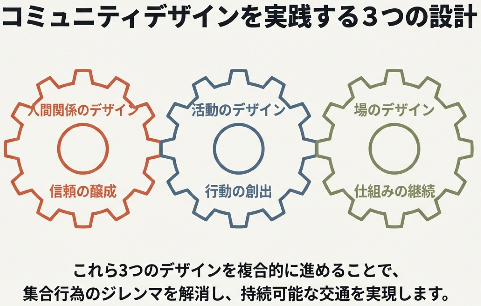 コミュニティデザインは、このジレンマを「個人の行動と集合的な利益を繋ぎ直す」ことで解消します。単に「利用してください」と呼びかけるのではなく、バスを利用することが「自分の地域の信頼できる仲間を支える行動」であり、「自分にとって楽しい活動」であるという構造を設計します。
