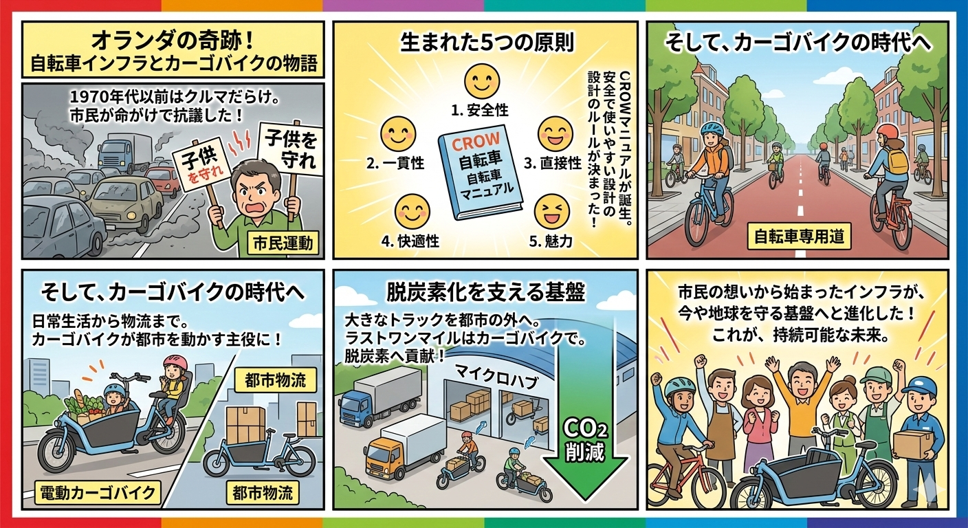 オランダの自転車設計マニュアル「CROW」と、都市物流の主役「カーゴバイク」の統合戦略を調査。1970年代の市民運動から生まれた5つの設計原則が、今や脱炭素化を支える物流基盤へ進化しています。日本の「2024年問題」や交通安全への適用可能性は?工学的数値、法的背景、マイクロハブの事例から、自転車を交通システムの中核に据える「オランダ流」のメカニズムを徹底解明します。