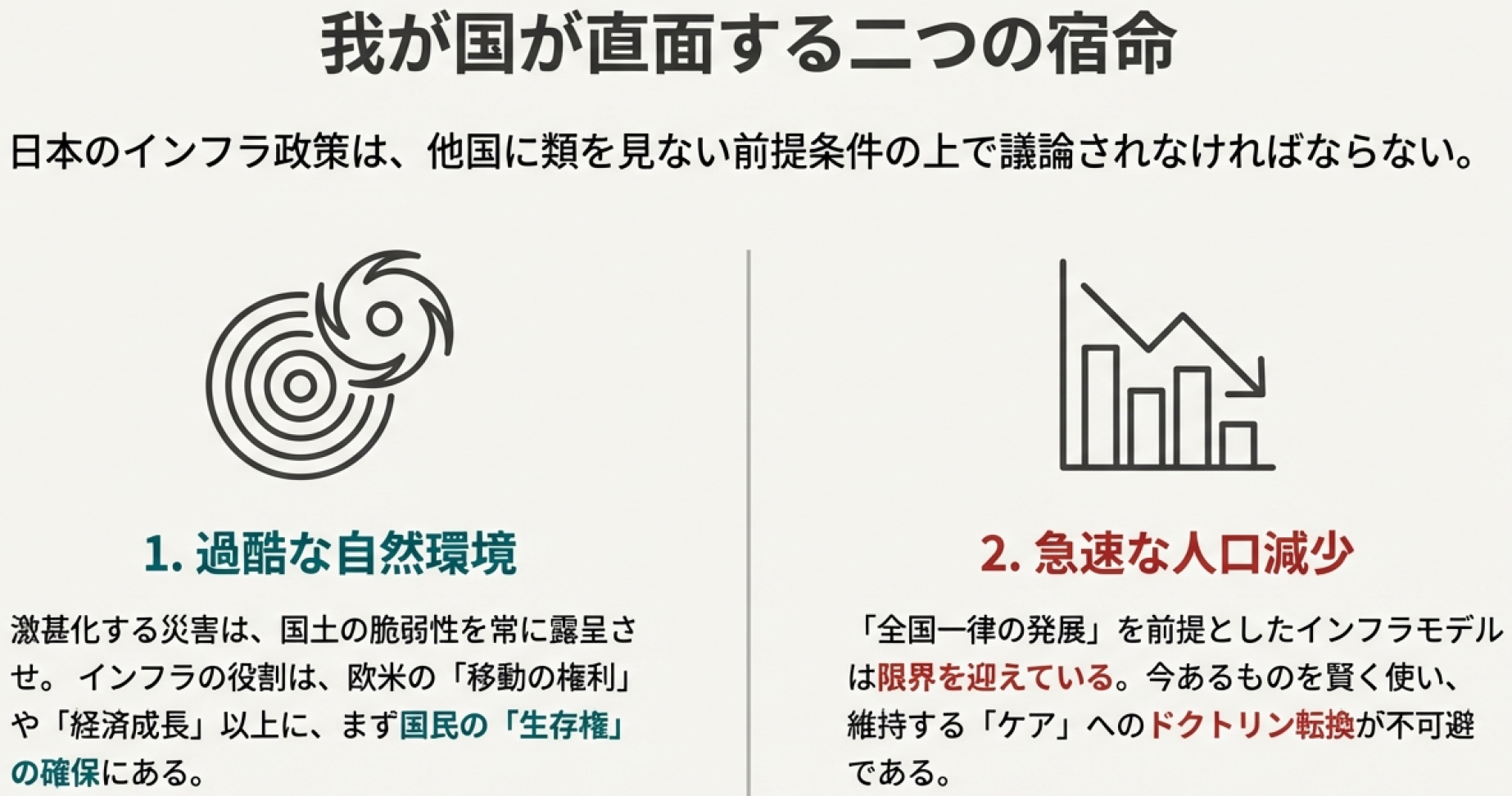 日本のインフラ政策は、世界でも類を見ない過酷な自然環境の中で、独自の進化を遂げてきました。また、急速な人口減少・少子高齢化に向き合っています。その根底には、経済合理性や環境正義といった欧米的なドクトリンとは一線を画す、生存の保障(レジリエンス)と地縁の維持(インクルージョン)という強固な思想が存在します。