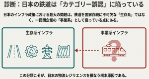 日本のインフラ政策において、道路や水道、電力は、国家の存続に不可欠な生存系インフラとして公的に維持・管理されます。対して、鉄道は民間企業によるサービスという事業系インフラのカテゴリーに押し込められているのです。この分類こそが、日本の物流レジリエンスを損なう原因です。国際的に見れば、鉄道は環境負荷低減・大量輸送・災害時のリダンダンシー(冗長性)を担う国家安全保障上の生存系インフラであり、その維持を私企業のP/L(損益計算書)に委ねる日本のモデルは、極めて特異なアノマリー(異常値)と言わざるを得ません。