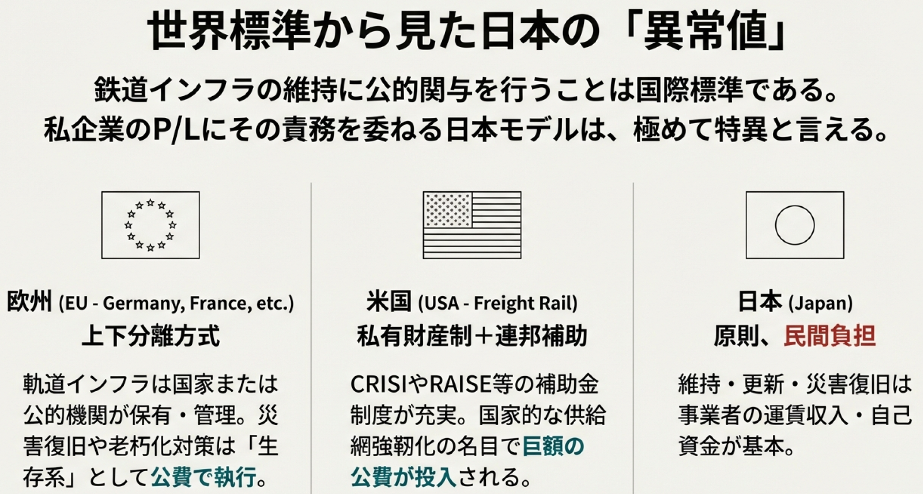 諸外国では、たとえ運営が民間であっても、インフラ(線路・構造物)の維持やレジリエンス強化には公的資金が投じられるのが標準なのです。