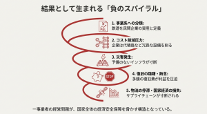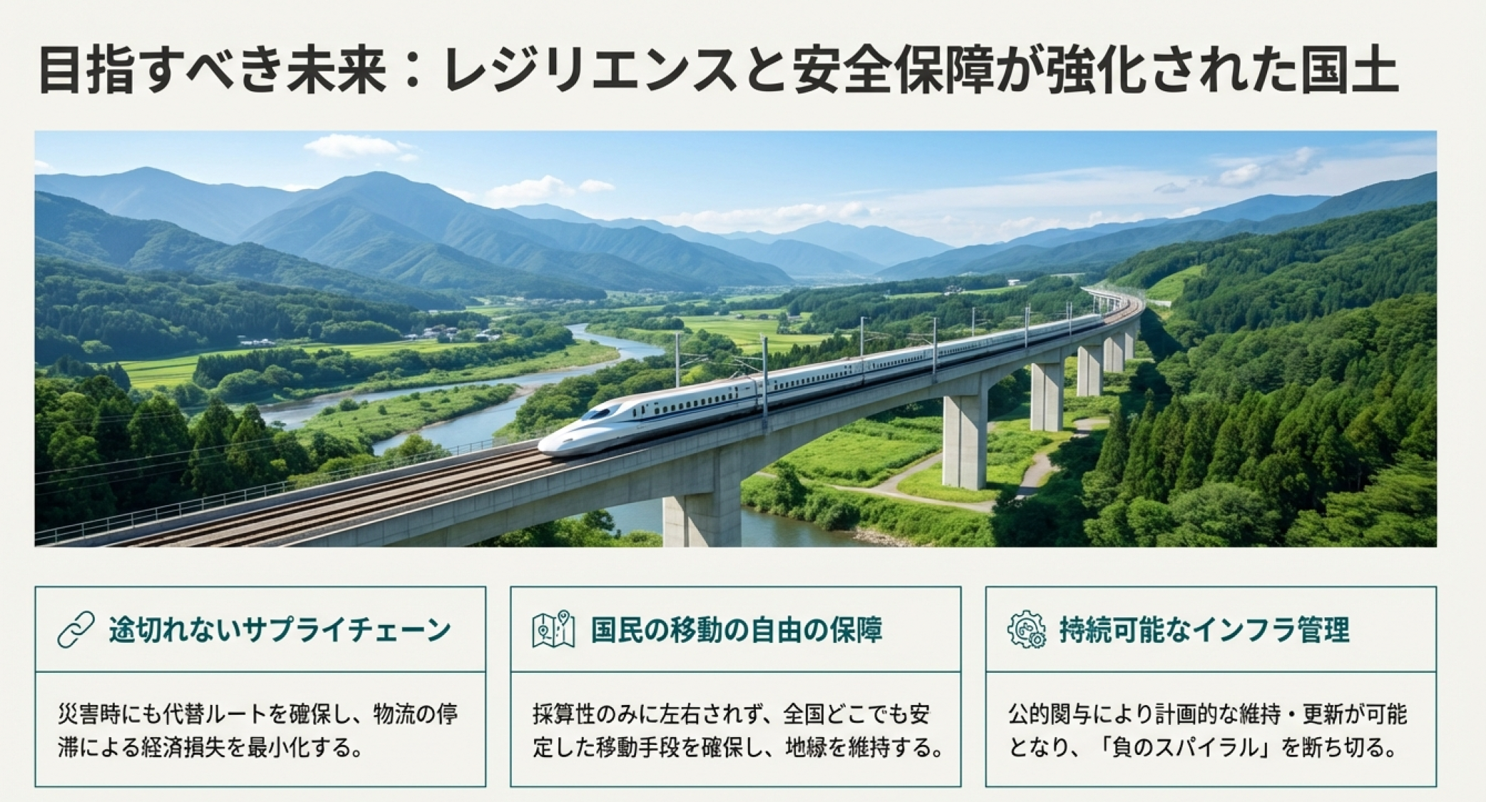 検証すべきポイント: 道路が被災すれば生存権の確保として即座に公費で復旧されるが、鉄道は赤字路線の採算性という事業論理で復旧が断念されるのです。このインフラ間のレジリエンス格差が、日本のサプライチェーンを脆弱なものにしています。