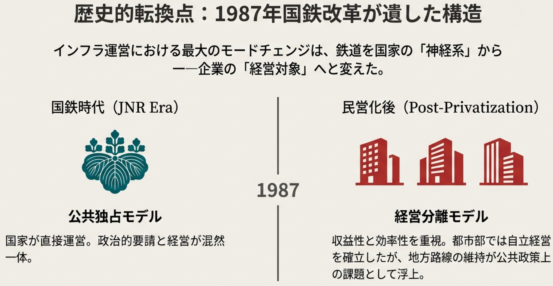 1980年代、巨額の累積債務と非効率に陥った日本国有鉄道の解体・分割民営化は、インフラ運営における最大のモードチェンジでした。