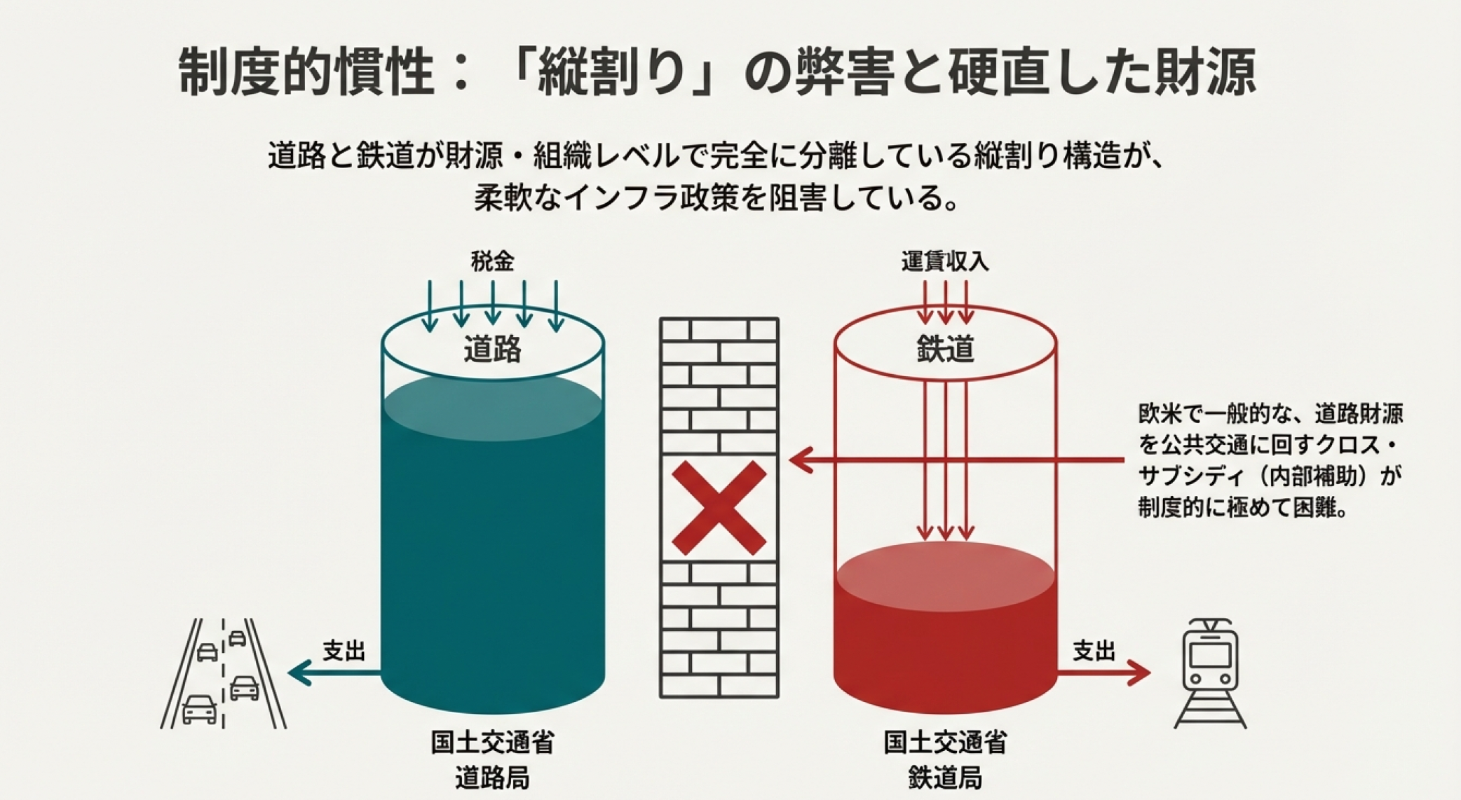 一方で、社会学者や政策学者は、道路と鉄道が財源・組織レベルで完全に分離している縦割り構造を指摘します。欧米のように、道路財源を公共交通に柔軟に回すクロス・サブシディ(内部補助)が制度的に難しい点は、人口減少下における地域交通網の再編を阻む制度的慣性となっています。