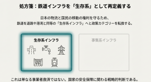 日本の物流を2024年問題や激甚化する災害から守るためには、鉄道インフラを事業系から生存系へと再定義し、道路並みの公的スキームを構築することが不可欠です。鉄道を私企業の負担に任せ続けることは、国家としての移動の権利と物流の安全保障の維持を難しくしかねないと思われます。。