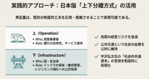 - 日本版「上下分離方式」:地方鉄道等の維持において、施設(下)を自治体が保有し、運行(上)を事業者が担う方式を採用しています。これは、宇沢的な「社会による維持」を制度化しつつ、民間的な「運行の効率性」を残す折衷的な設計です。