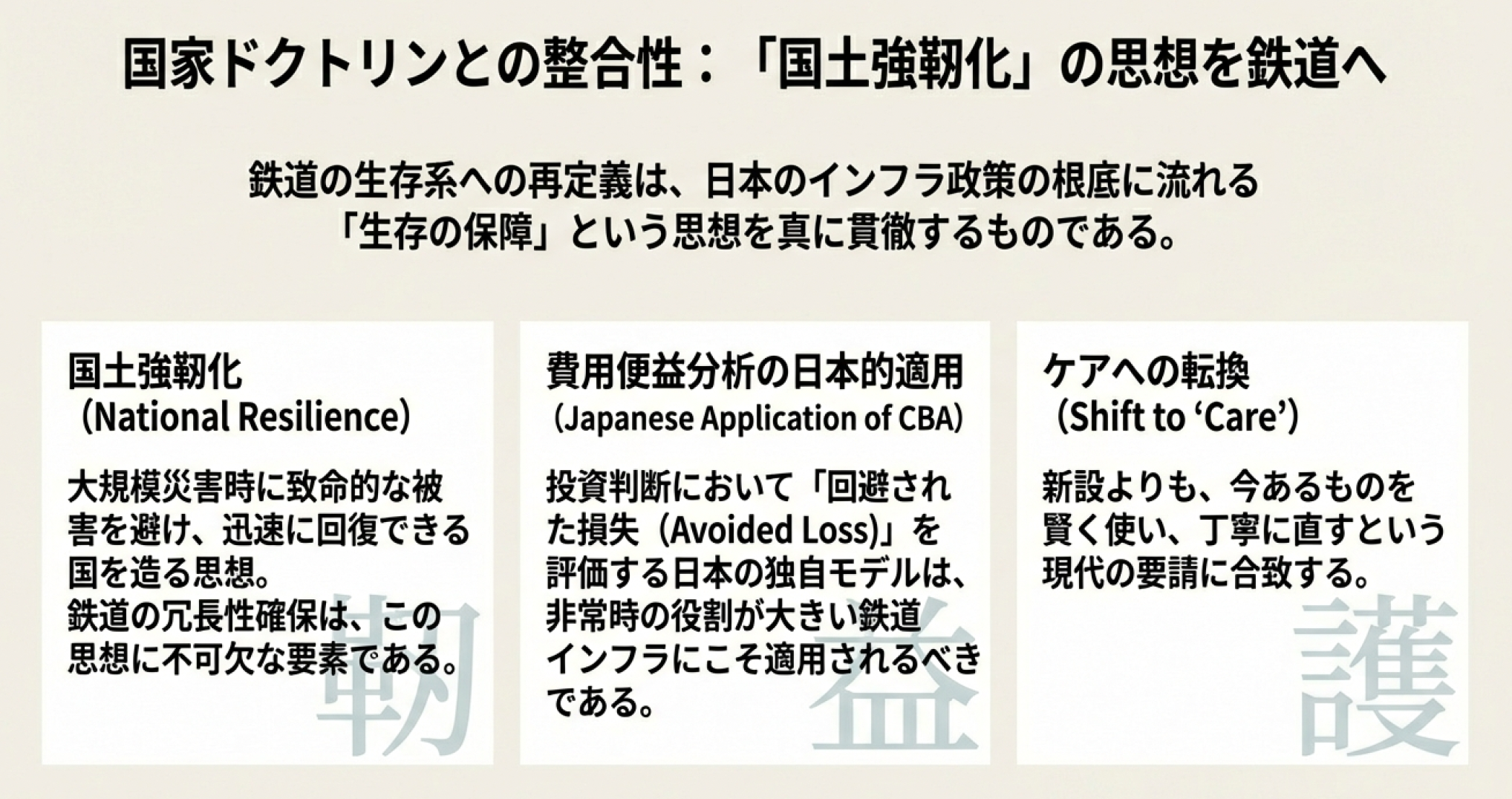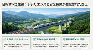 - 国土強靭化(National Resilience): 大規模災害時に致命的な被害を避け、迅速に回復できる国を造る思想です。これは「生存権」をインフラの第一義とする日本独自のドクトリンです。欧州が「移動の権利」を、米国が「経済成長」を謳う中、日本は「命を守ること」を最上位に置きます。