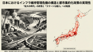 明治維新以来の「拡大の時代」が終わり、インフラ維持という新たな国難が幕を開けました。もはや道があれば人が住む時代ではなく、人が住む場所にのみインフラを集中させる「デカップリング」が不可欠です。予防保全による長寿命化と、維持できない地域からの戦略的撤退。この二段構えの「スマートな縮小」こそが、将来世代への過大な負担を避ける唯一の道です。人口減少社会における都市のあり方を根本から問い直します。
