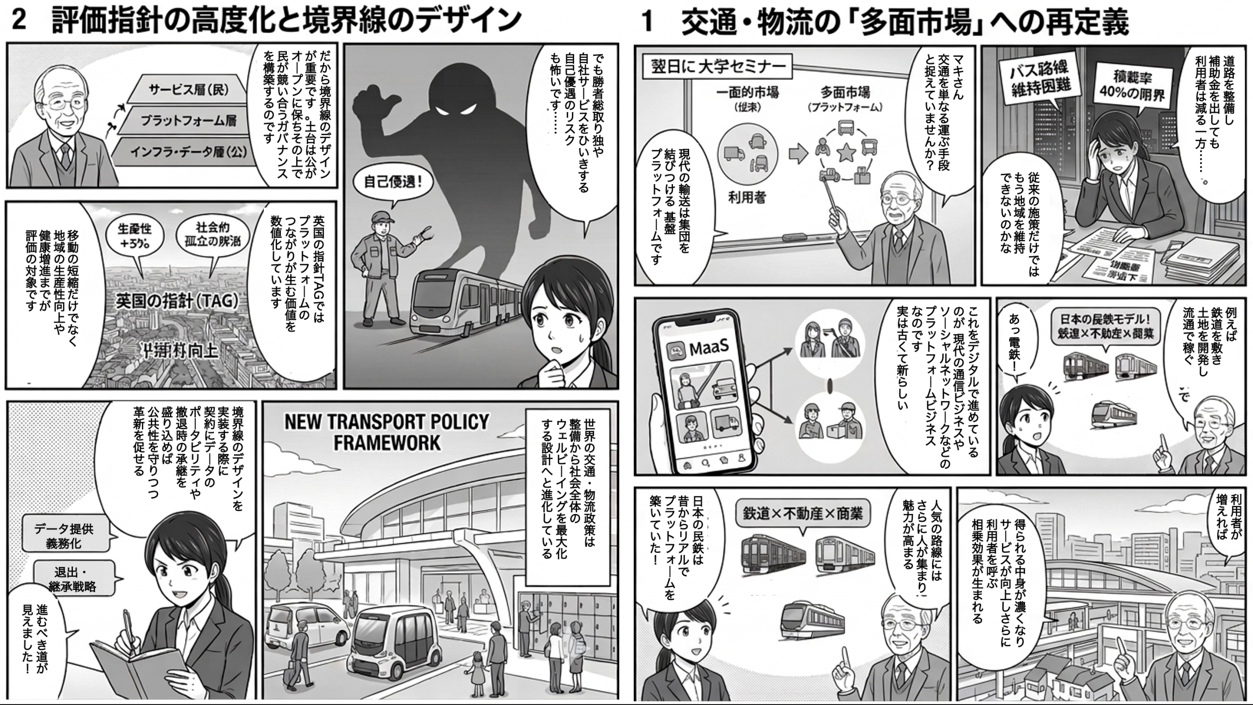 デジタル技術の急速な進展は、交通および物流の概念を、単なる物理的な移動や運搬の手段から、データとサービスが高度に交差する多面的なプラットフォームへと変容させた。従来の政策立案は、道路や線路といったハードウェアの整備、あるいは一方向的なサプライチェーンの効率化に主眼が置かれていたが、現代の交通・物流網は、多様なプレイヤーが相互に影響を及ぼし合う「エコシステム」として機能している。本報告書では、ジャン・ティロール(Jean Tirole)らによる多面市場(Multi-sided Markets)の理論を軸に、交通・物流分野におけるプラットフォームの構造を再定義する。また、日本の民鉄モデルと現代的MaaSの構造的差異、物流における共同化の効果を実証的に分析し、英国の評価指針(TAGおよびRSVT)を参考に、社会的価値や集積の経済を考慮した評価手法の高度化を検討する。最終的には、勝者総取りや自己優遇といったプラットフォームの課題を克服するための「境界線のデザイン」と、公共性と競争性を両立させるレイヤー構造ガバナンスについて提言を行う。