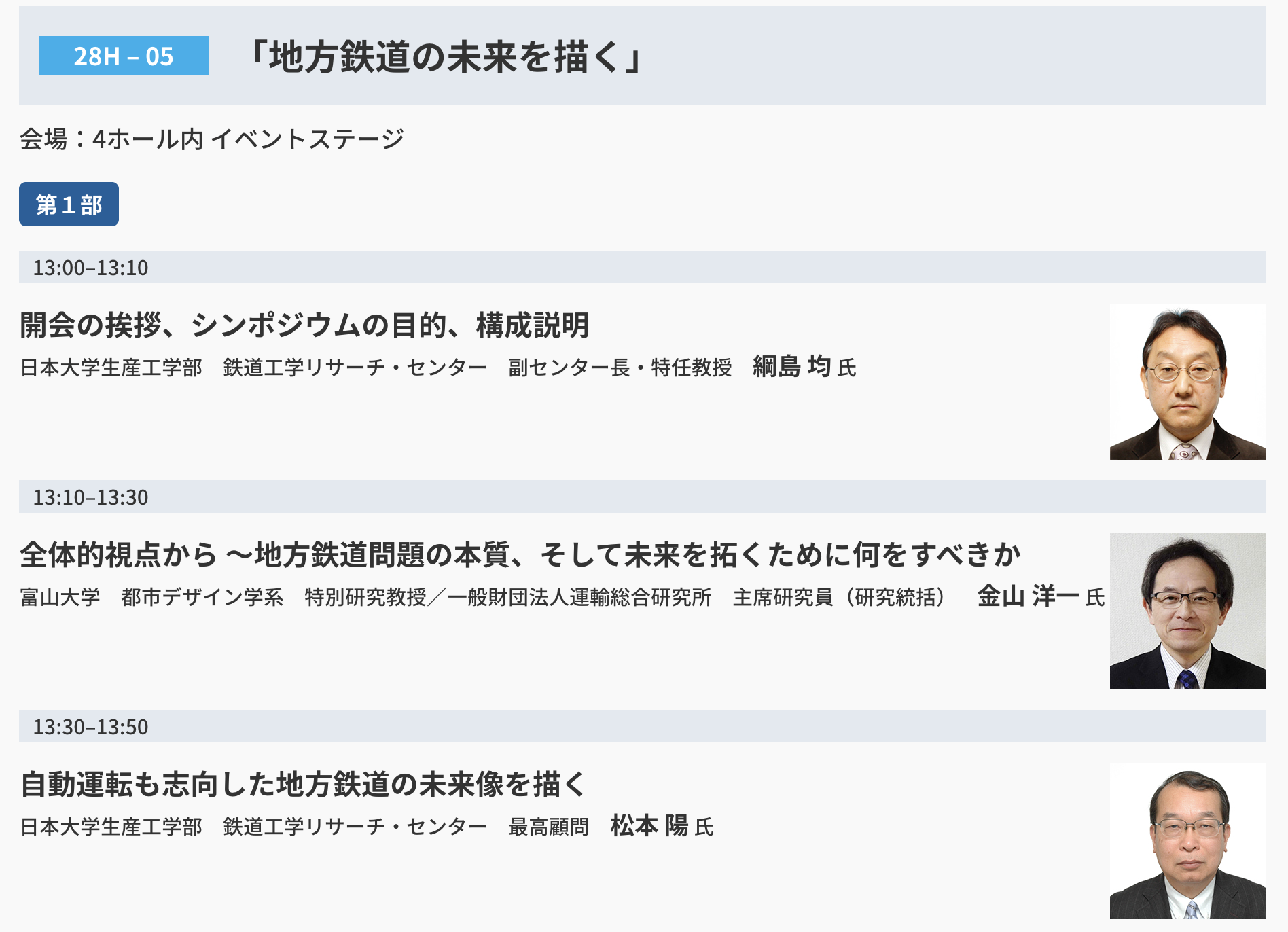 当日のプログラム 28H – 05「地方鉄道の未来を描く」会場:4ホール内 イベントステージ