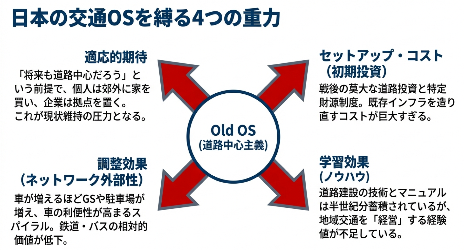 日本の交通政策においても、戦後の高度経済成長期に最適化された道路中心の仕組みが、一種のOS(基本ソフト)として定着しました。当時の状況下では、このOSは国土の隅々まで迅速にアクセスを確保するための合理的な選択でした。しかし、人口減少期に入った現代、このOSを書き換えることを阻む4つのメカニズム(自己強化メカニズム)が働いています。