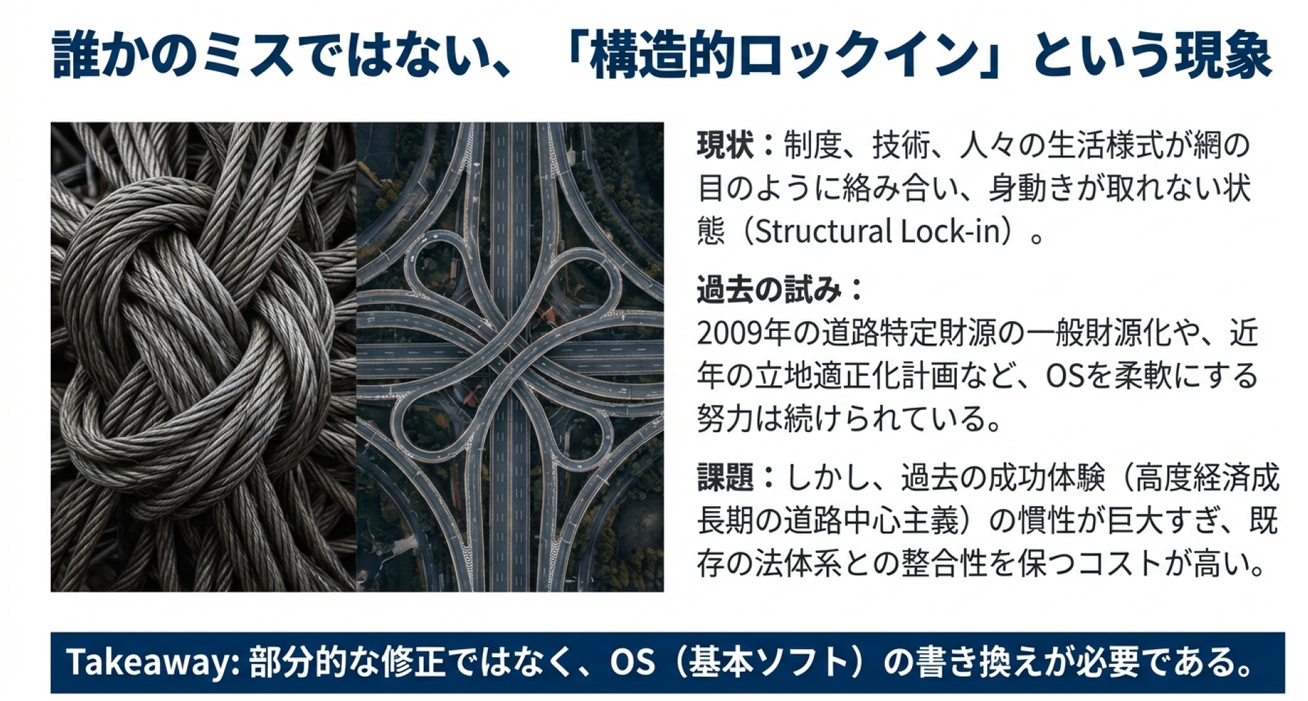 これは特定の誰かの判断ミスではなく、制度、技術、人々の生活様式が網の目のように絡み合った結果、身動きが取れなくなる構造的ロックイン(固定化)という現象です。
