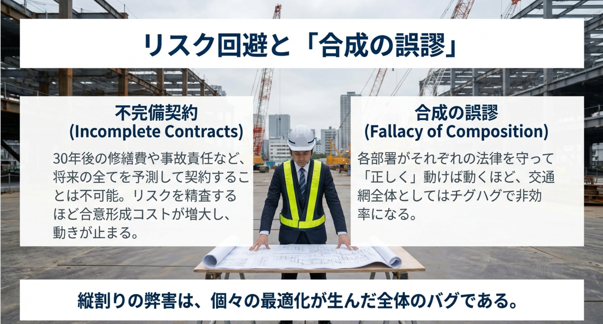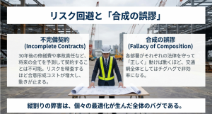 制度の経済学では、将来のあらゆる出来事をあらかじめ予測して契約を結ぶことは不可能であると考え、これを不完備契約(ふかんびけいやく)と呼びます。交通インフラのような数十年続く事業では、この不確実性が調整コストをさらに押し上げます。