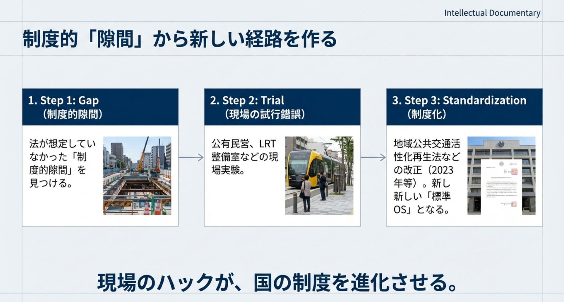 こうした現場の試行錯誤が、後の地域公共交通活性化再生法などの法整備へとつながり、新しい経路(New Path)が公式な制度として認められるプロセスを形作っていきます。