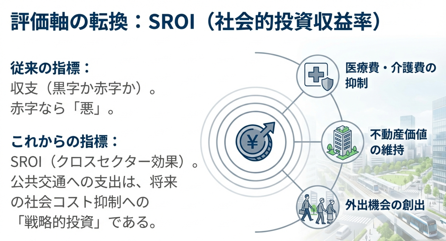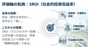 これに対し、近年注目されているのが社会的投資収益率(SROI:社会的価値を貨幣価値に換算して投資効果を測る手法)です。例えば、公共交通を維持することで高齢者の外出機会が増えれば、要介護化が遅れ、地域の医療費や介護費が削減されます。また、駅周辺の再開発により不動産価値が維持されれば、固定資産税の減少を防ぐことができます。