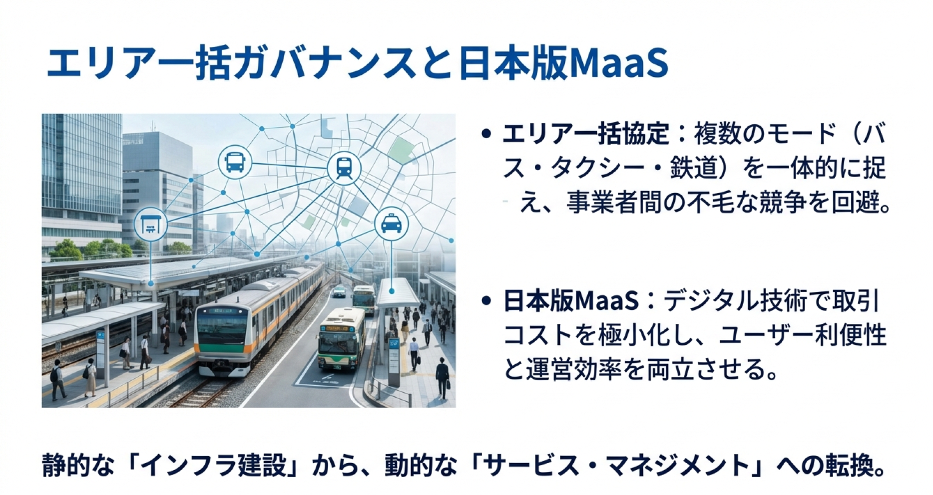 近年、国においても地域公共交通活性化再生法の改正などを通じ、こうした縦割りの弊害を解消するための枠組み作りが進められています。自治体が主導して複数の事業者をまとめる一括協定の仕組みなどは、個別の交渉にかかる取引コストを組織的に引き下げようとする試みです。