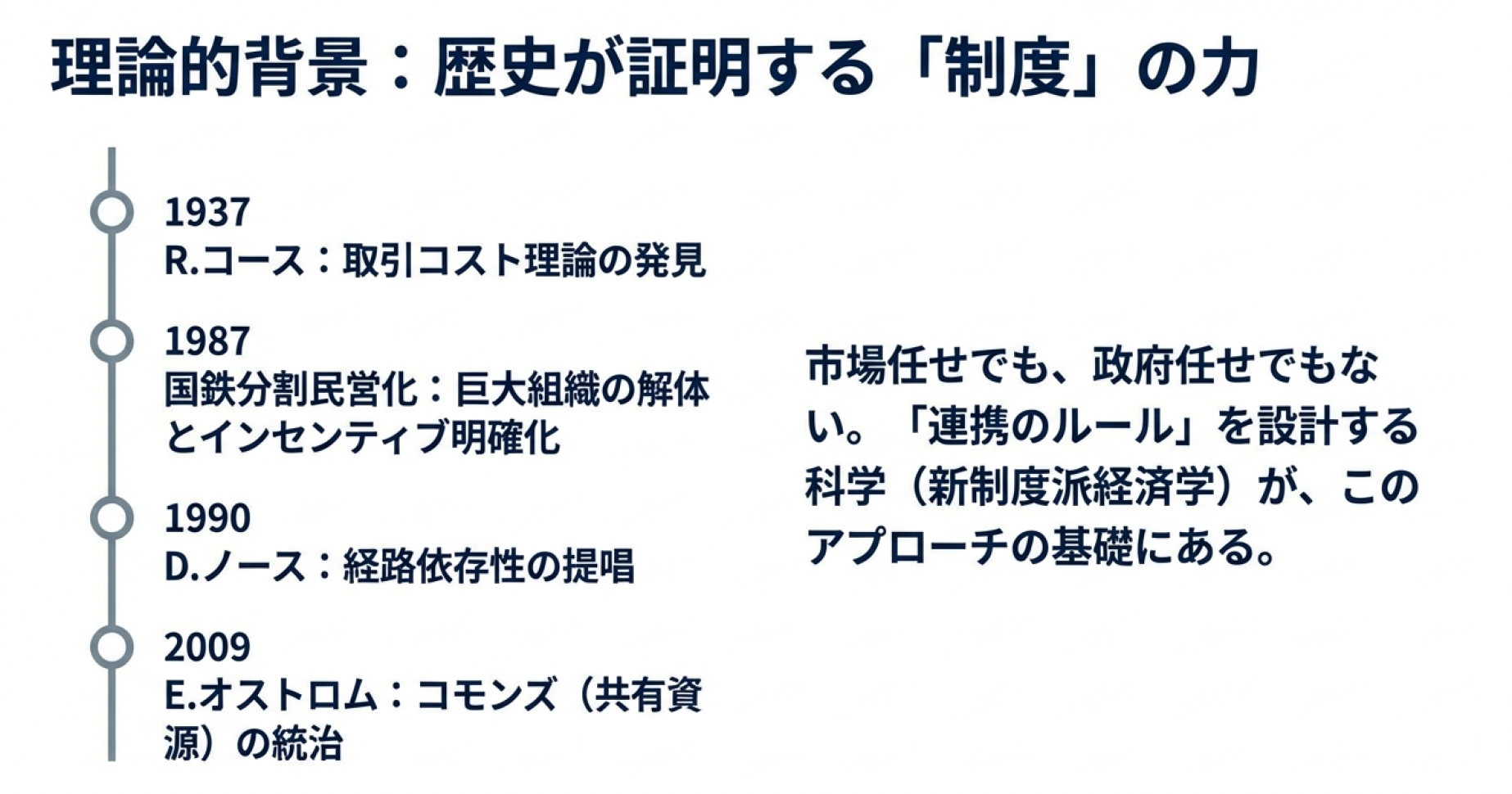 経済学を数式の中の抽象的な市場から、生身の人間が作るルールと組織の力学へと引き戻した歴史を整理します。