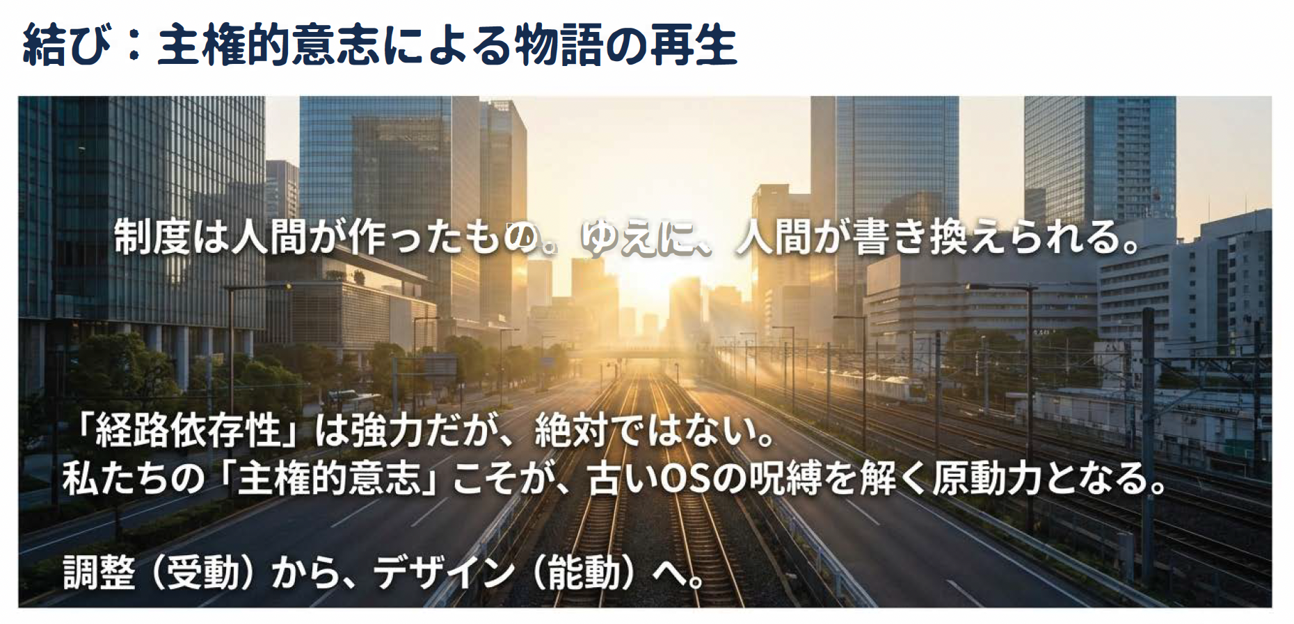 ダグラス・ノースが説いたように、制度は人間が作ったものであり、その経路(パス)を変えることができるのも人間だけです。私たちがどのような地域社会で、どのような移動を享受したいのかという主権的意志(しゅけんてきいし:自ら決定する主体的な意志)こそが、古いOSの呪縛を解く最大の原動力となります。