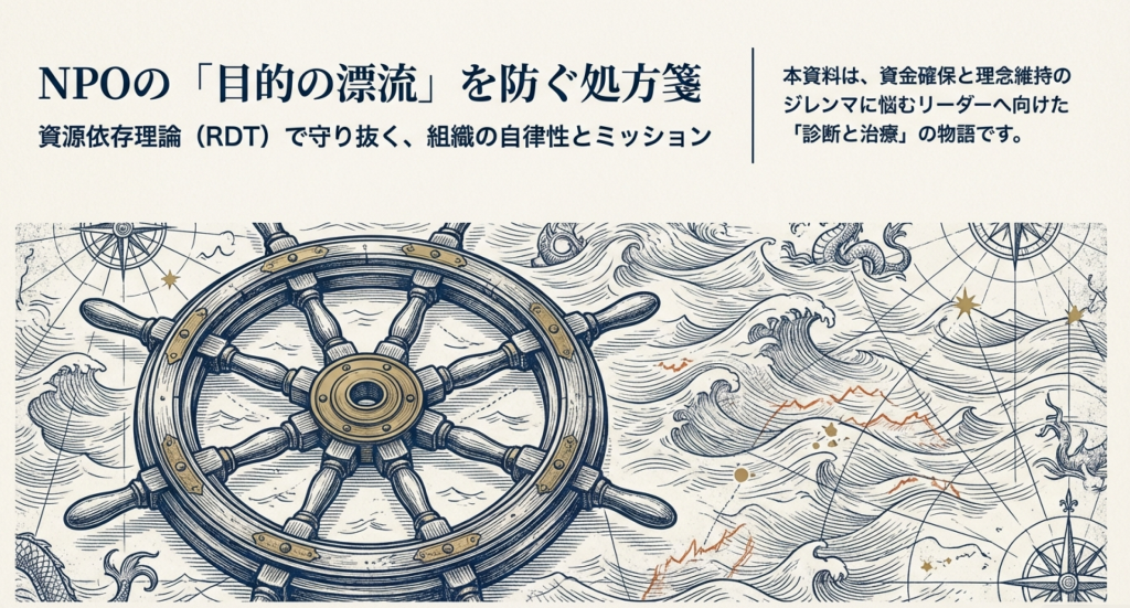 資金はあるが理念が見えない。そんなNPOの苦悩を説明するのが資源依存理論です。行政の委託金への過度な依存は、いつの間にか活動内容が行政の意向に左右されるミッション・ドリフト(目的の漂流)を招きます,。活動継続のための資金確保と、組織の魂である自律性をどう両立させるか。依存先を分散し、独自の価値で相互依存へと転換するためのマネジメントの極意を学びます,。組織の持続可能性を高める第一歩がここから始まります。
