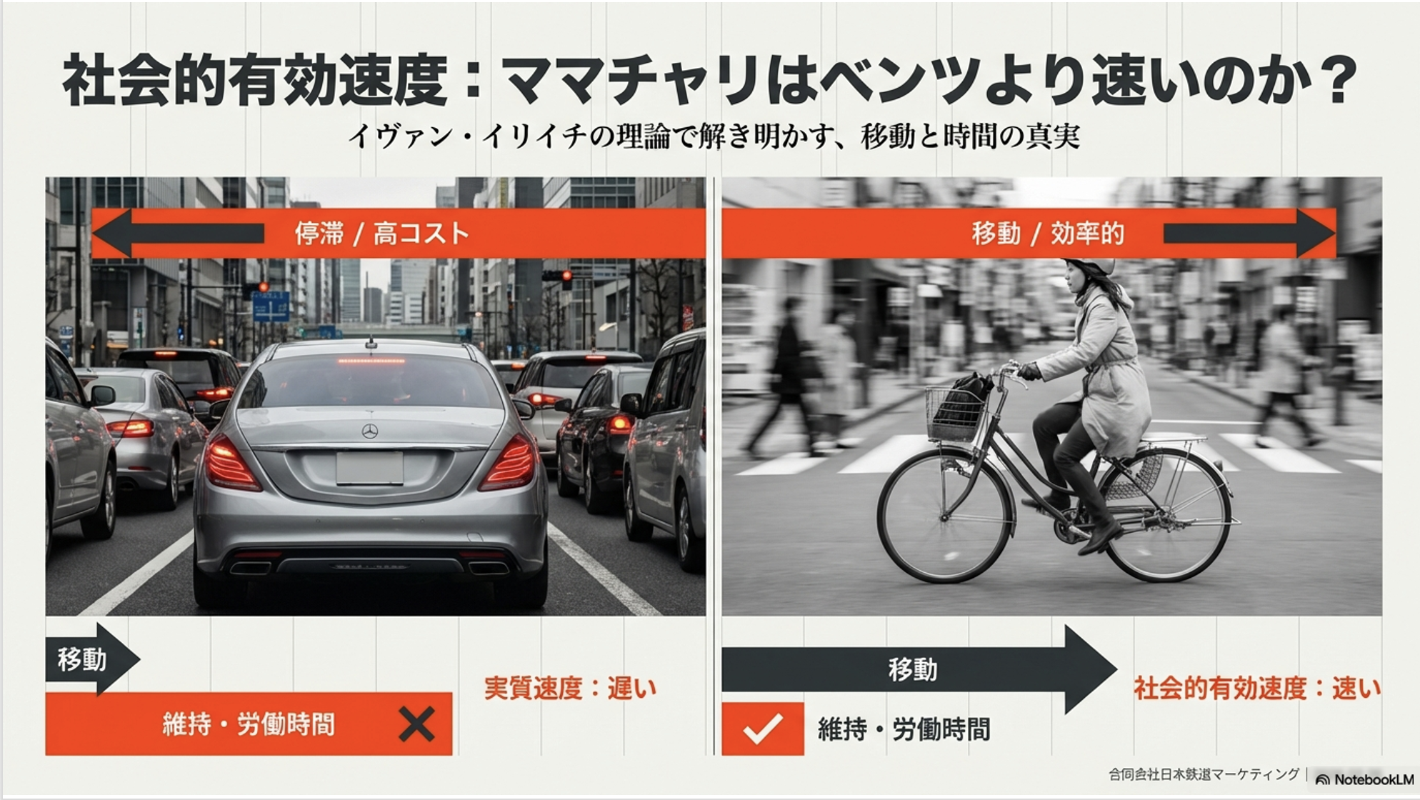 社会的有効速度とは、単なる走行時間だけでなく、その移動手段を社会的に維持するために必要な全ての時間(個人的な労働時間および税負担分を稼ぐ時間等)を分母とした、真の移動効率を指す指標です。
