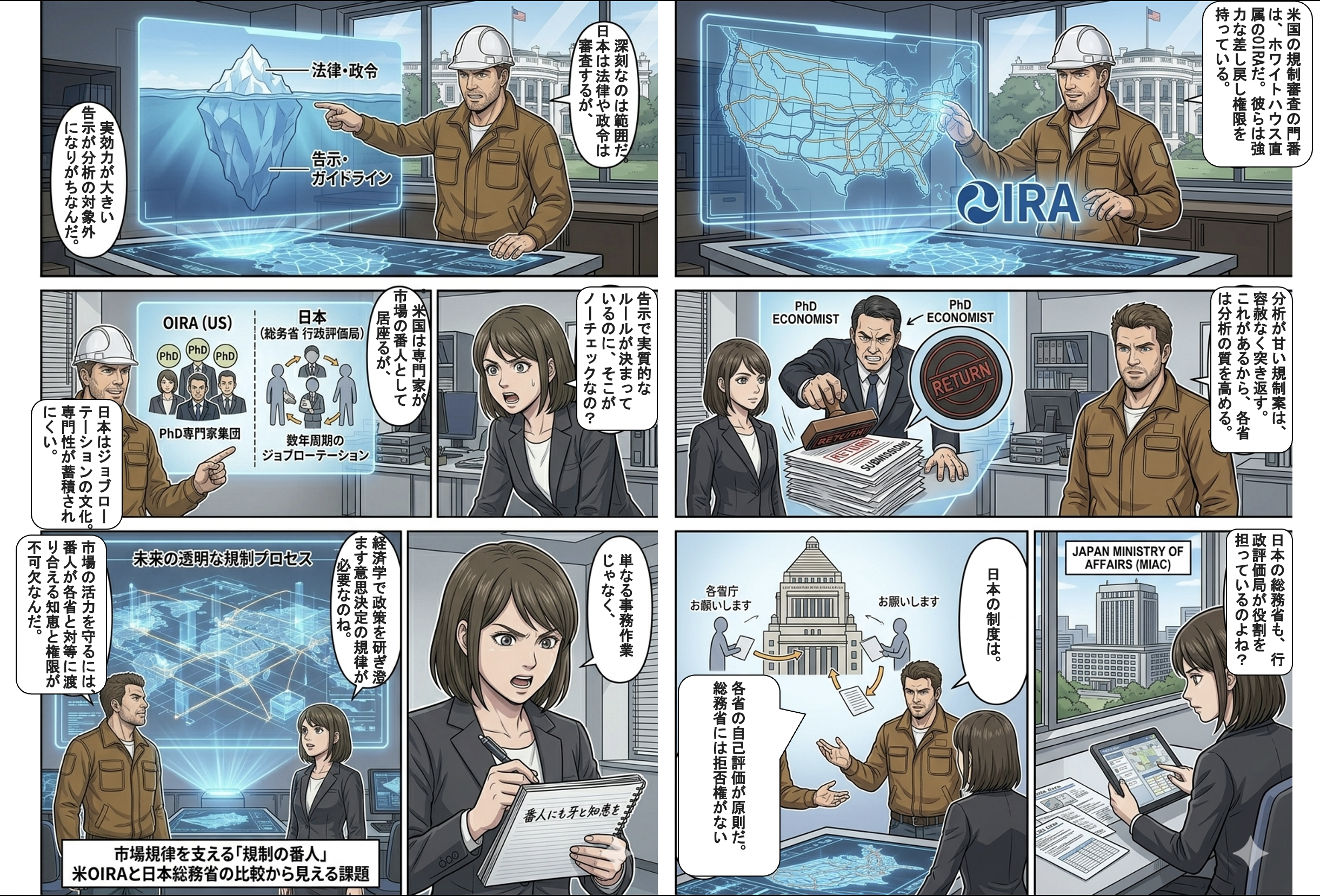 米国の事例は、強力な権限(差し戻し権限)と高度な専門性(PhDエコノミスト)が組み合わさることで、初めて行政組織内の縦割りを打破し、市場への不必要な介入を抑止できることを示しています。また、政権交代によって分析指針(割引率等)が劇的に変化する現実は、RIAがいかに政治経済的な意志と密接に関連しているかを物語っています。