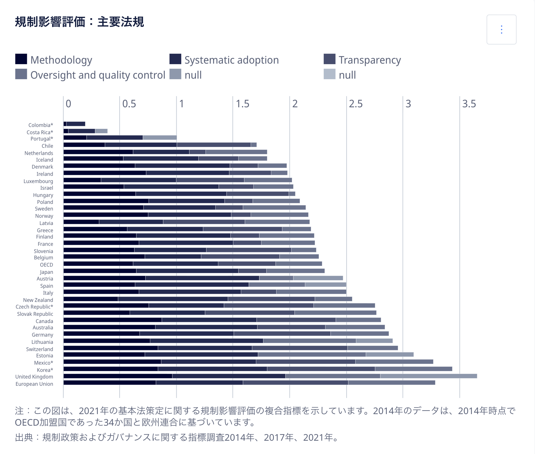 OECD経済協力開発機構)が公表している「規制政策・ガバナンス指標(Indicators of Regulatory Policy and Governance: iREG)」は、加盟国のRIA体制を「手続」「分析品質」「網羅性」「透明性」の観点からスコアリングしています 1