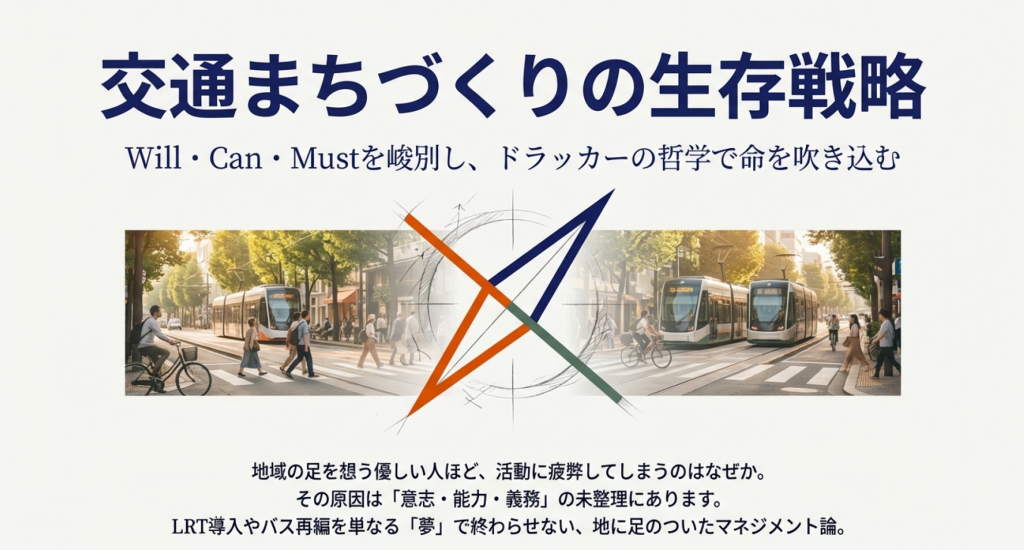 活動のバーンアウトを防ぐ。なぜ、地域の足を想う優しい人ほど活動に疲弊してしまうのか。その原因は、意志・能力・義務が未整理のまま放置されていることにあります。ドラッカーは「問題ではなく機会に焦点を合わせよ」と説きました。社会の弱点を見つけ、自分たちの独自の強みでそれを埋める。この一貫したロジックが、組織に永続的な命を吹き込みます。LRTやバス再編を単なる夢で終わらせない、地に足のついた「志のマネジメント」を学びましょう。