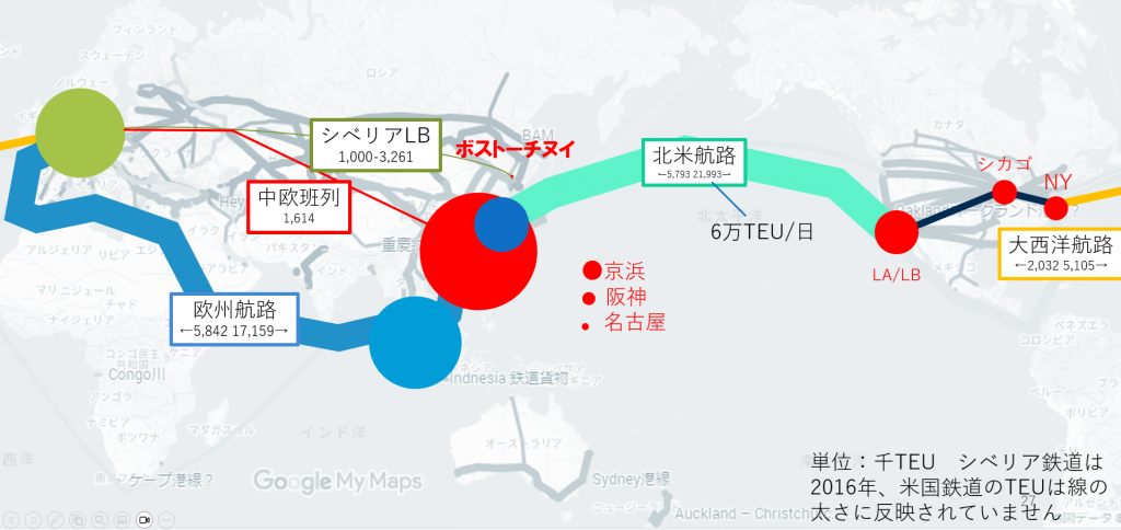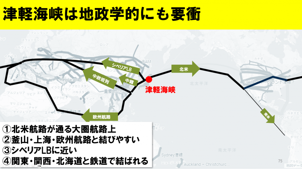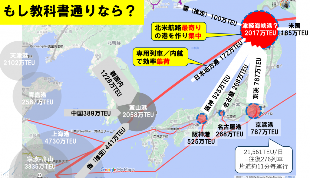 さまざまな制約があるので今は妄想に過ぎませんが、もし日本が教科書通りの戦略をとると、北米航路に最も近い港に貨物を集中させることになるので、津軽海峡に港を作り貨物を集中させることになります。これが成功すると世界10位以内の取扱量となり、日本の貿易は再び世界に返り咲くかもしれません。また、津軽海峡はアジア・北米・南米を一直線で結ぶ大圏航路上で、ユーラシア大陸を横断する鉄道輸送路「シベリアランドブリッジ」や「中央班列」の分岐点にも当たるので地政学的にも要衝です。そして、もし京浜港の貨物を鉄道で運ぶとしたら、11分間隔で貨物列車を走らせ続ける量になり、並行在来線は線路使用料で相当潤うと予想され、なかなか面白いことになります。
