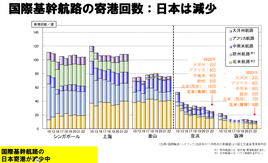 現実は冷酷で、日本への寄港だけが減少しています。特に最も重要な北米航路の寄港が減り続けています。なぜ、日本が教科書と真逆な戦略をとっているのか?実はよくわかりません。