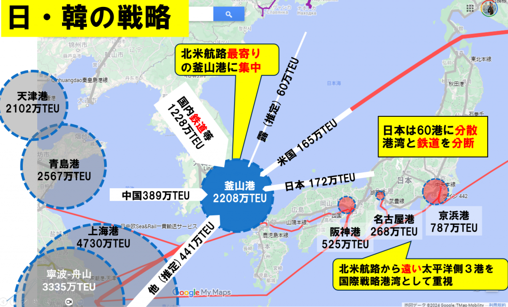 1990年、韓国は、マッキンゼーのレポートの通り、北米航路に最も近い釜山港に貨物を集中させ、鉄道と直結させました。一方、なぜか日本は真逆の道を行きます。コンテナ港を全国60港に分散させ、港と鉄道を分断させてきました。また、日本海側を通る北米航路から離れた太平洋側の港を「国際戦略港湾」として重視し続けています。釜山以外にも、黄海には世界最大の上海港や2000万TEUを超える天津港、青島港などがあり、規模の経済を追求する国際基幹航路を引き寄せています。果たして貨物量が小さく遠回りとなる太平洋側の港に船は来るのでしょうか?