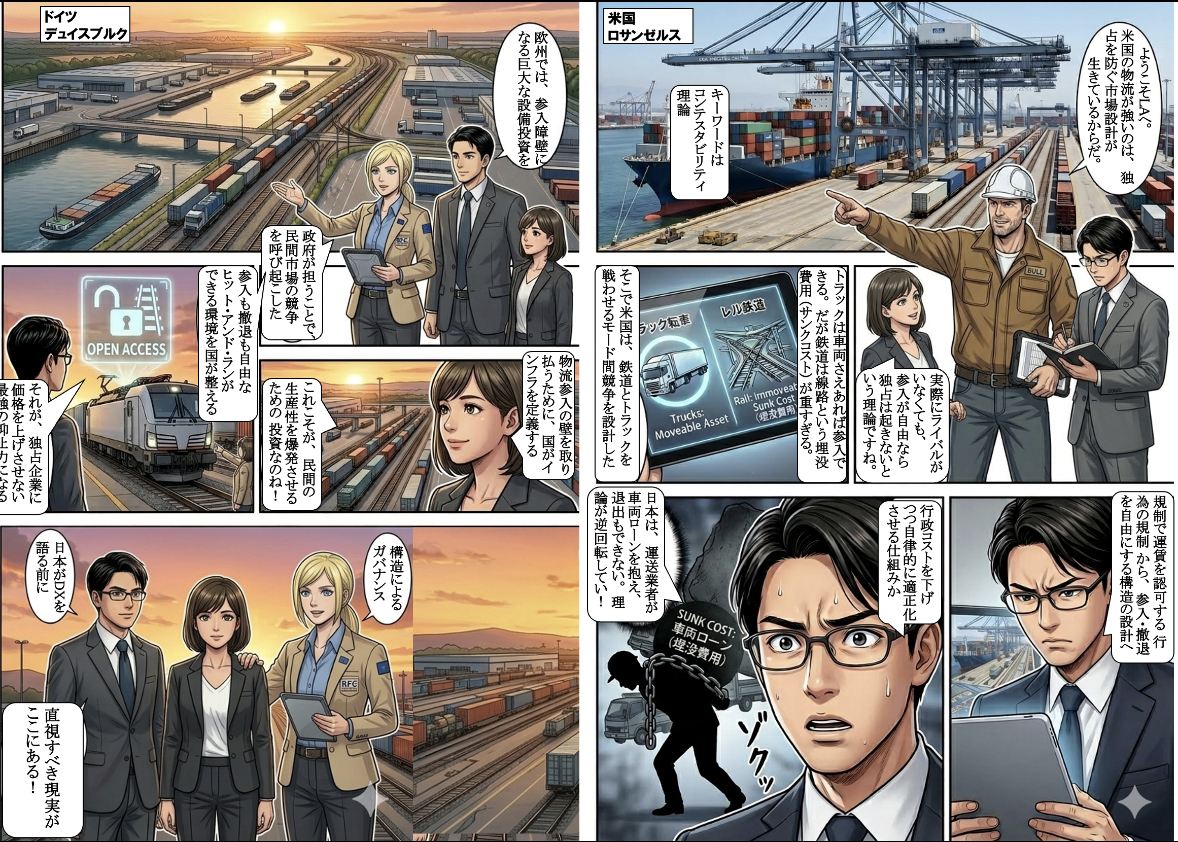 • 退出の困難さ: 米国では非効率な企業が次々と倒産・買収されることで市場が集約されましたが、日本ではセーフティネットや商慣行により、非効率な業者が低運賃で市場に残り続け、市場全体の適正化を阻害しました。