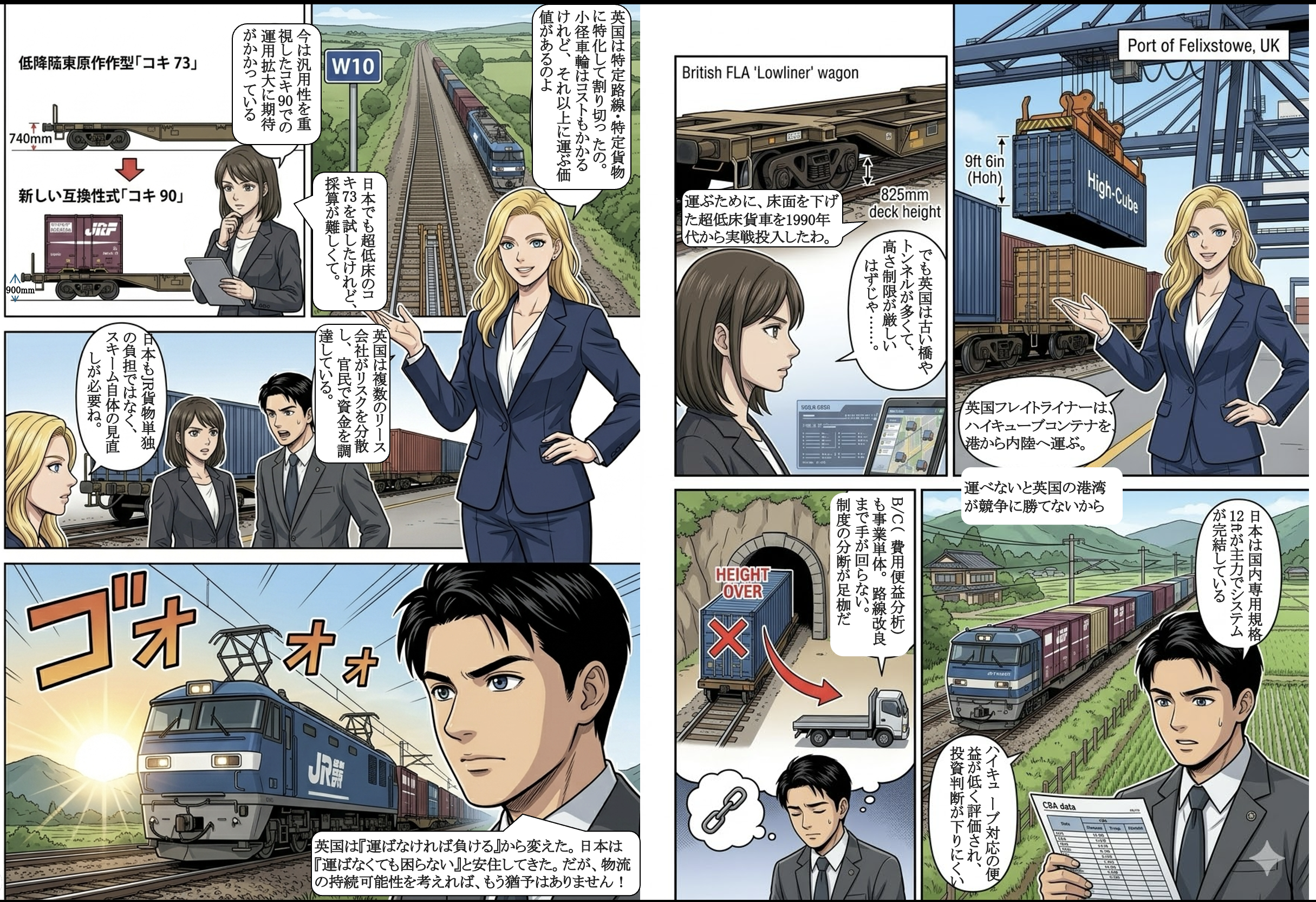また、制度面では英国のような複数事業者・市場競争の導入は制度的に異なるものの、車両調達・保有の多様化という観点は参考になる。英国では複数のリース会社が存在し、特殊車両投資のリスク分散に貢献した。日本でも官民連携による車両開発支援やグリーンボンドの活用など、JR貨物単独では負担の大きい大型投資における資金調達スキームを強化する余地がある。また、インフラ整備(通過限界拡大)を早期に推進することで、貨車のみならず路線全体の物流容量を増加させる英国の方策も日本での長期展望に資する。総じて、英国の経験は「市場要求に応じた車両技術の機動的開発」と「インフラ対応の両輪」が重要であることを示しており、日本においても物流の効率化に向けた戦略策定に役立つと考えられる。