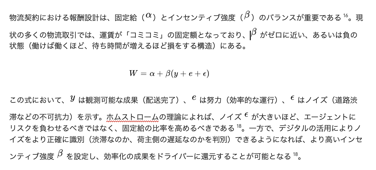 ホムストロームの「情報提供原則」によれば、エージェント(運送事業者)の行動について追加的な情報を提供する任意の信号は、それがたとえ不完全であっても、契約に含めることでインセンティブの効率性を向上させることができる 18。現代の物流においては、IoTデバイス、デジタルタコグラフ、GPS等を通じて、トラックの運行状況や「荷待ち」の実態を極めて高い精度で可視化できる。