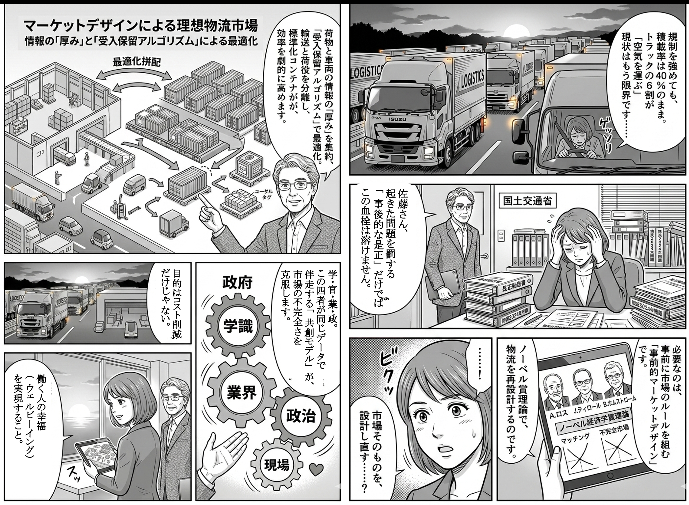 この深刻な不完全市場を打破するためには、従来の「事後的な是正(Ex-post regulation)」、すなわち問題が発生した後に是正勧告や罰則を与える手法から、市場のルールそのものを事前に設計し、調整の失敗を最小化する「事前的マーケットデザイン(Ex-ante market design)」への抜本的なパラダイムシフトが不可欠である。本報告書では、ノーベル経済学賞受賞者であるアルヴィン・ロス(Alvin Roth)の「マッチング理論」、ジャン・ティロール(Jean Tirole)の「プラットフォームガバナンス論」、そしてベント・ホムストローム(Bengt Holmström)の「契約理論」という三つの理論的支柱を統合し、欧米型の構造改革(標準化・集積化・荷役と運輸の分離)を日本社会に実装するための「学識・政府・業界・政治」の四者共創モデルを提示する。