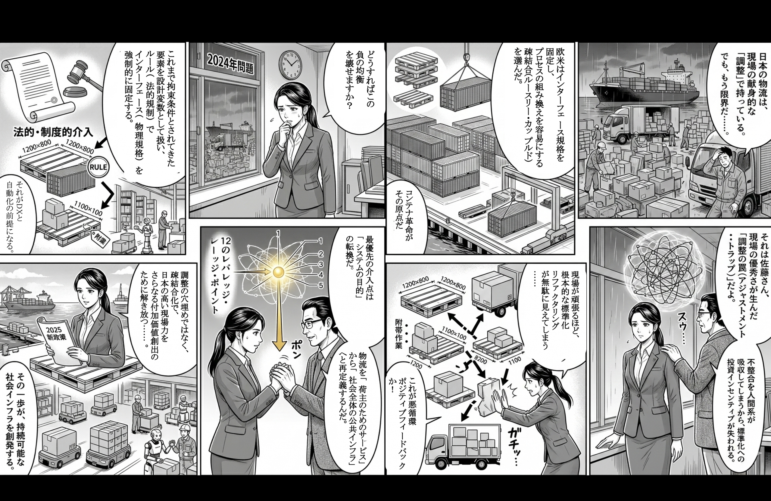 日本の物流システムを「調整の罠」から救い出すには、現場の努力に頼ることをやめ、アーキテクチャそのものを「疎結合型」へとリファクタリングする必要があります。コンテナ革命がそうであったように、インターフェースの強制的な固定こそが、次世代の自動化・効率化を呼び込むためのレバレッジ・ポイントとなります。日本の高い現場力は、不整合の穴埋めではなく、標準化された強固な基盤の上でさらなる付加価値を創出するために活用されるべきです。