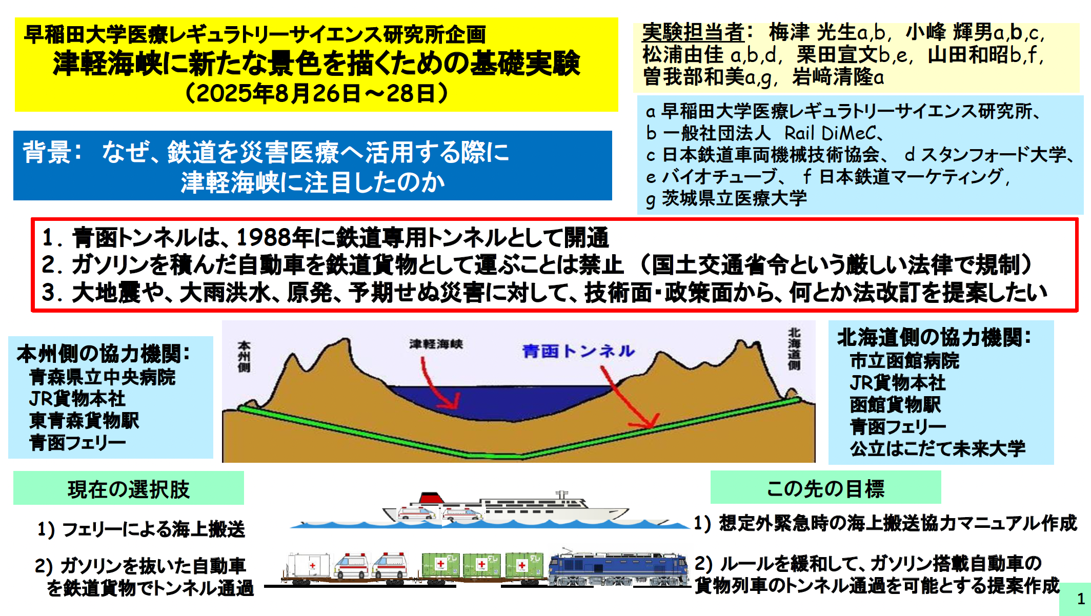 Rail DiMeCが目指す鉄道コンテナによる医療資機材輸送は、全国に展開できる可能性を持っていますが、北海道と本州の間については制約があります。青函トンネルは、1988年に鉄道専用トンネルとして開通しましたが、ガソリンを積んだ自動車を鉄道貨物として運ぶことは禁止(国土交通省令という厳しい法律で規制)されています。大地震や、大雨洪水、原発、予期せぬ災害に対して、技術面・政策面から、何とか法改訂を提案したいという背景から今回の実験は計画されました。