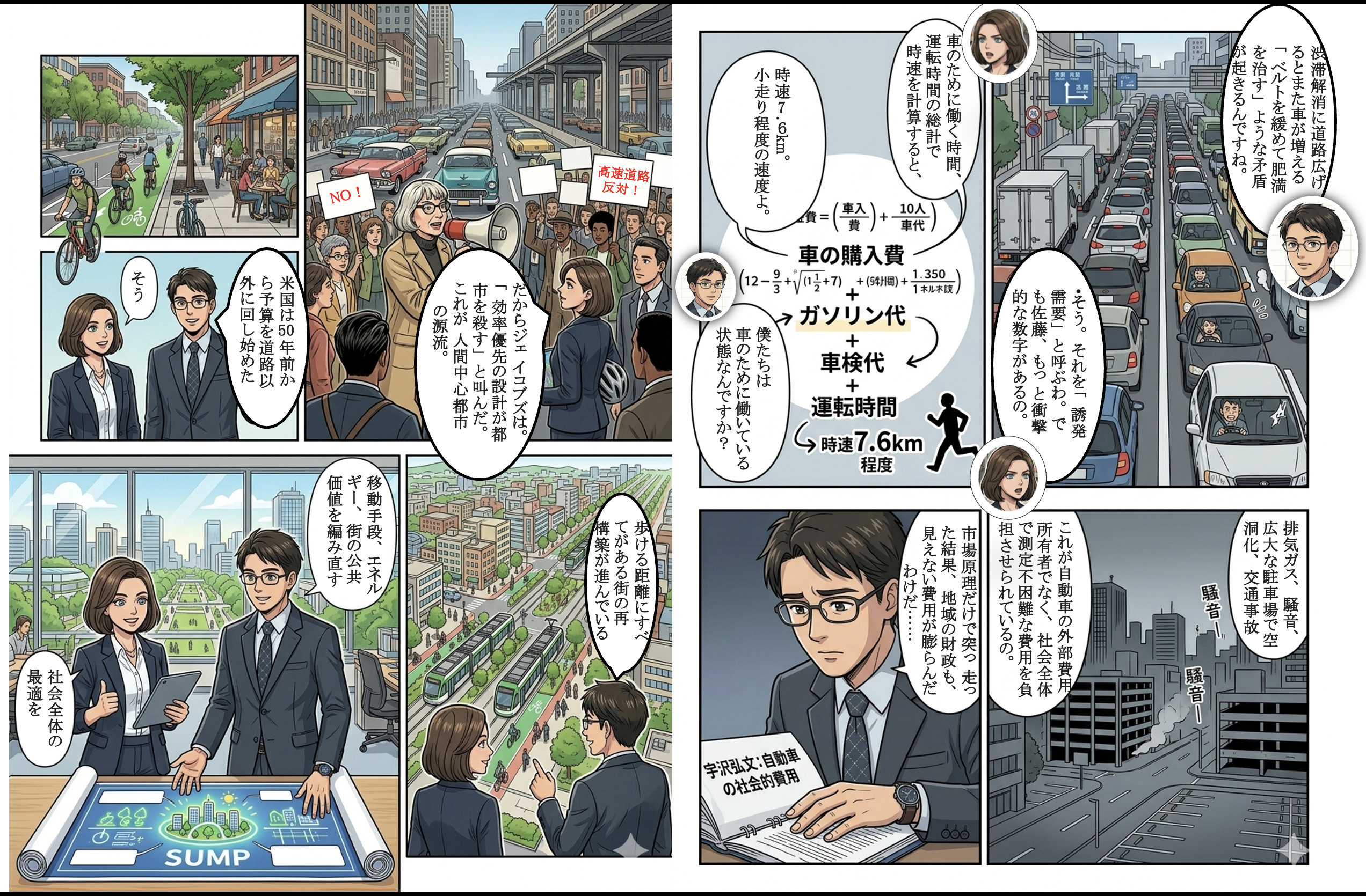 [音声概要] 自動車との折り合いだけでなく、ジェイコブズの人間尺度や創造都市を引き継ぎつつ、自然・伝統・効率・機会・地域・透明性などの視点を加えたフレームワークを提供しています。この内容が後述するSUMPの「都市圏」「市民参画」「弱い人の声を聞く」といった方針に反映されているように思えます。