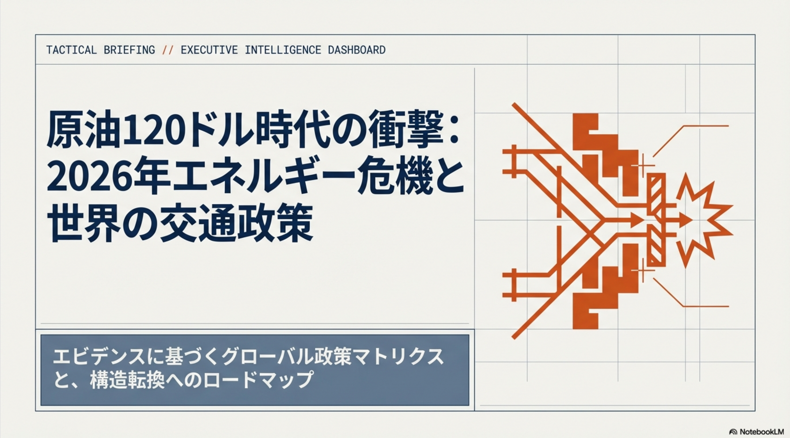 2026年、ホルムズ海峡封鎖による原油高騰が世界を直撃。交通政策は「移動の確保」という生存権の戦いへ。ドイツの価格監視、韓国のAI運行最適化、日本の巨額補助金など、各国の緊急対策を徹底分析。単なる延命措置か、それとも脱炭素への構造転換か?最新のエビデンスに基づき、グローバルな政策マトリクスと、AIがもたらす15%の燃料削減効果を解明します。