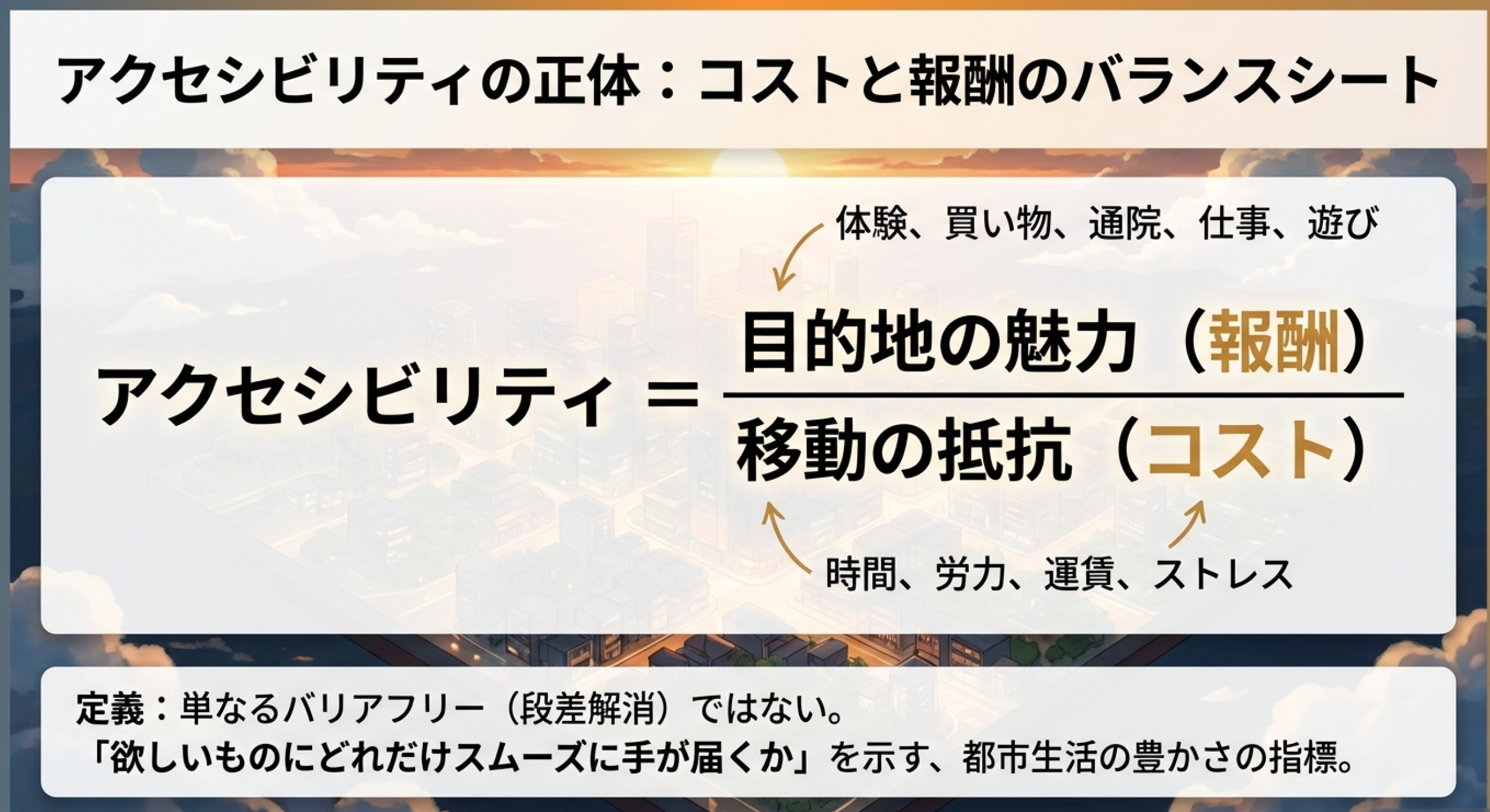 アクセシビリティとは単なる移動の速さでも物理的な近さでもなく、「ある地点から、どれだけの生活機会(報酬)を、どれだけのコスト(時間・費用)で獲得できるか」という、都市空間の総合的なパフォーマンスを指す指標です。