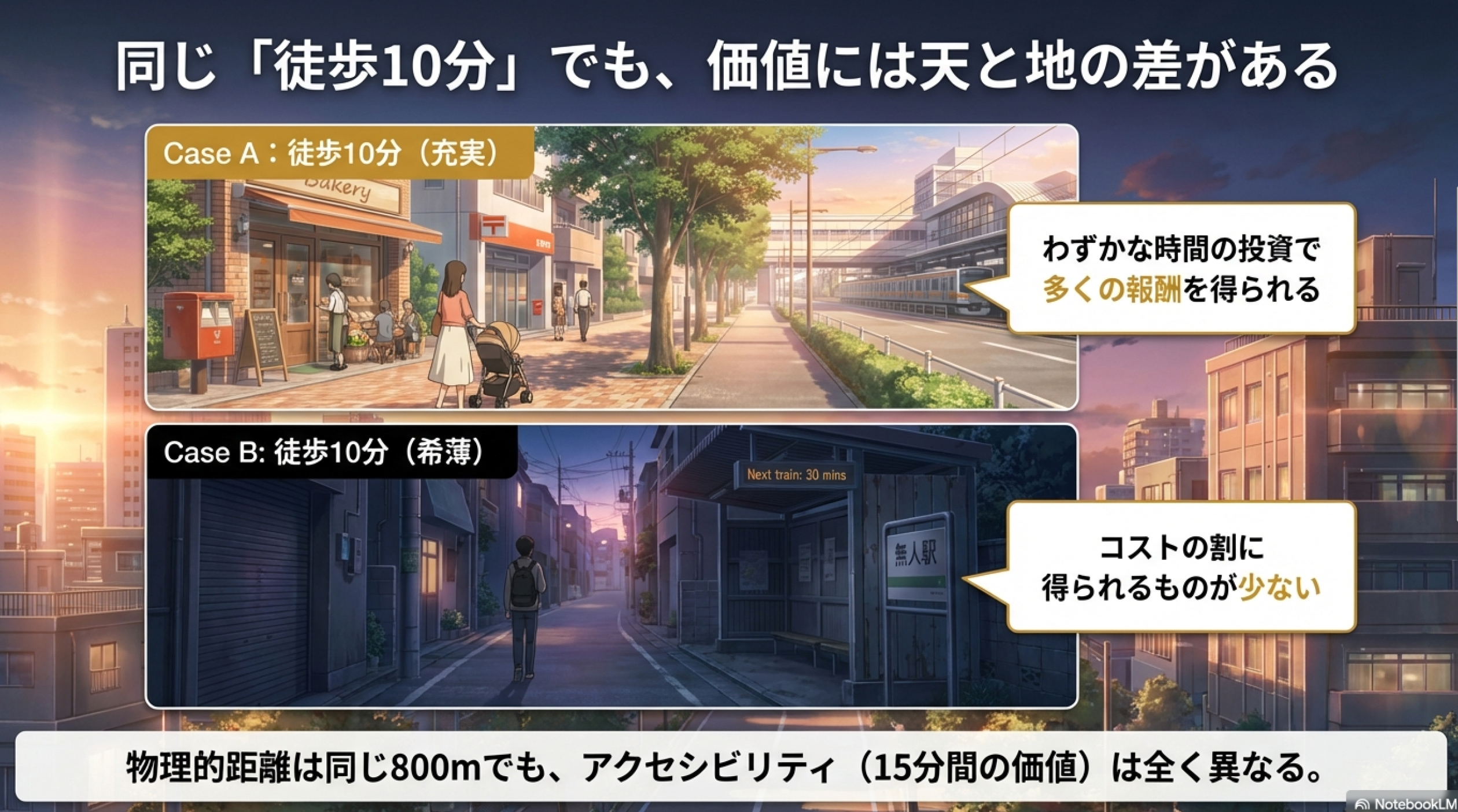 物理的な距離が同じ800mであっても、この2つの場所が提供する15分間の価値(アクセシビリティ)には天と地の差があります。前者はわずかな時間の投資で多くの報酬を得られる効率の良い地点であり、後者はコストの割に得られるものが少ない場所といえます。