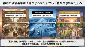 アクセシビリティの歴史を振り返ると、私たちは移動の苦労を減らす時代から時間の質を高める時代へと移り変わってきたことが分かります。昔の都市は距離に縛られ、20世紀の都市は速度に依存しました。そしてこれからの都市は、いかに短い時間で豊かな選択肢を提供できるかという、アクセシビリティの質で選ばれることになります。